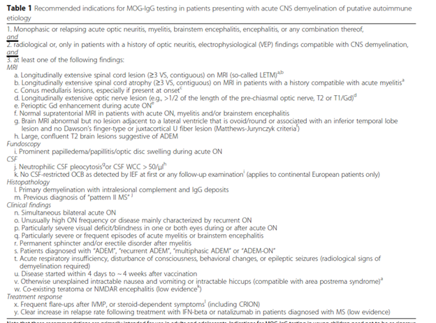 - “In practice, many patients diagnosed with AQP4-IgG-negative NMOSD according to the IPND 2015 criteria will meet also the criteria for MOG-IgG testing…and should thus be tested. However, MOG-IgG testing should not be restricted to patients with AQP4-IgG-negative NMOSD.”38